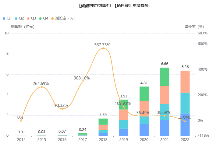 司维拉姆原研来自赛诺菲Genzyme,主要用于控制正在接受透析治疗的慢性肾脏病(CKD)成人患者的高磷血症,为国家医保品种(乙类)。适应症虽然狭窄,但由于中国成人慢性肾病的高发病率(约10.8%),该品种在国内的市场依然稳步增长。据药融云统计,2021年院内销售额达6.7亿元,2022年前三季度同比增长31%。