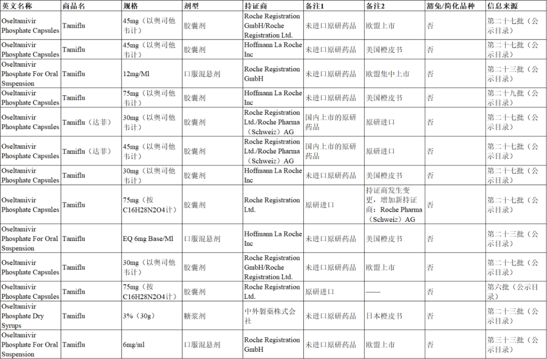 奥司他韦不同制剂获批企业数