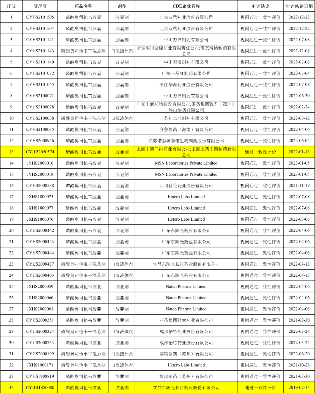 据CDE官网显示,目前已有34品规奥司他韦产品通过一致性评价(含视同过评),过评剂型仅有口服液体剂和胶囊剂。其中,磷酸奥司他干混悬剂有7条,涉及7家药企;磷酸奥司他胶囊有27家,涉及17家药企。其中,Hetero Labs Limited、广东东阳光、博瑞制药、宜昌东阳光、成都倍特药业同时都过评了这2种制剂。