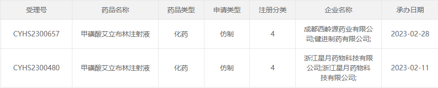 2月,CDE受理了两项甲磺酸艾立布林注射液仿制上市申请,分别来自成都西岭源药业/健进制药和浙江星月药物。目前该乳腺癌“化药珠峰”注射液国内仅原研获批生产销售,纳入医保后,药品降价高达81.7%,2022年销售额大涨253%,市场潜力巨大。该药“国内首仿药”位置空缺,且申报药企较少,竞争不算激烈,各药企均有机会夺得。