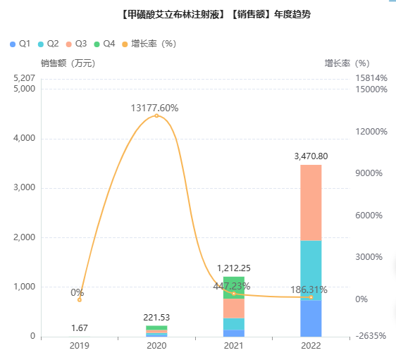 目前该药尚无国内首仿药诞生,仅原研获批生产销售。2021年底,日本卫材株式会社的艾立布林通过谈判正式纳入医保目录,价格从原来的一支药3980元降价到一支药只要726元。高达81.7%的价格降幅,带来了销售量的快速增长,2022年前三季度艾立布林院内销售额也随之大涨253%,突破3千万元,市场潜力巨大。