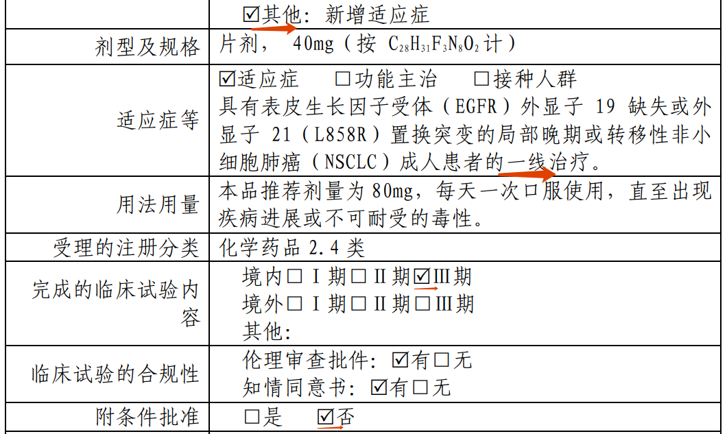 经风险获益评估,现有研究和数据支持本品增加适应症用于“具有表皮生长因子受体(EGFR)外显子19 缺失或外显子21(L858R)置换突变的局部晚期或转移性非小细胞肺癌( NSCLC)成人患者的一线治疗。