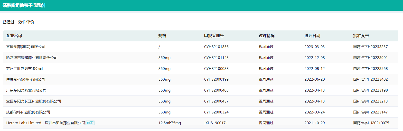 磷酸奥司他韦干混悬剂一致性评价通过情况