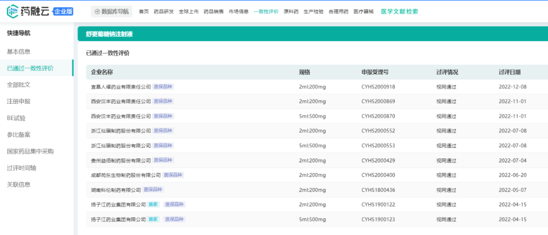 经药融云数据库查询显示,扬子江药业的舒更葡糖钠注射液率先于2022年4月获批上市,拿下国内首仿(视同通过一致性评价),后续湖南科伦制药、苑东生物、贵州益佰制药、浙江仙琚制药、西安汉丰药业、宜昌人福等也相继过评。加上此次的南京泽恒医药,国内目前拥有舒更葡糖钠注射液药品批文的企业共有9家,除获批进口的默沙东外,其他国内药企都已通过一致性评价。