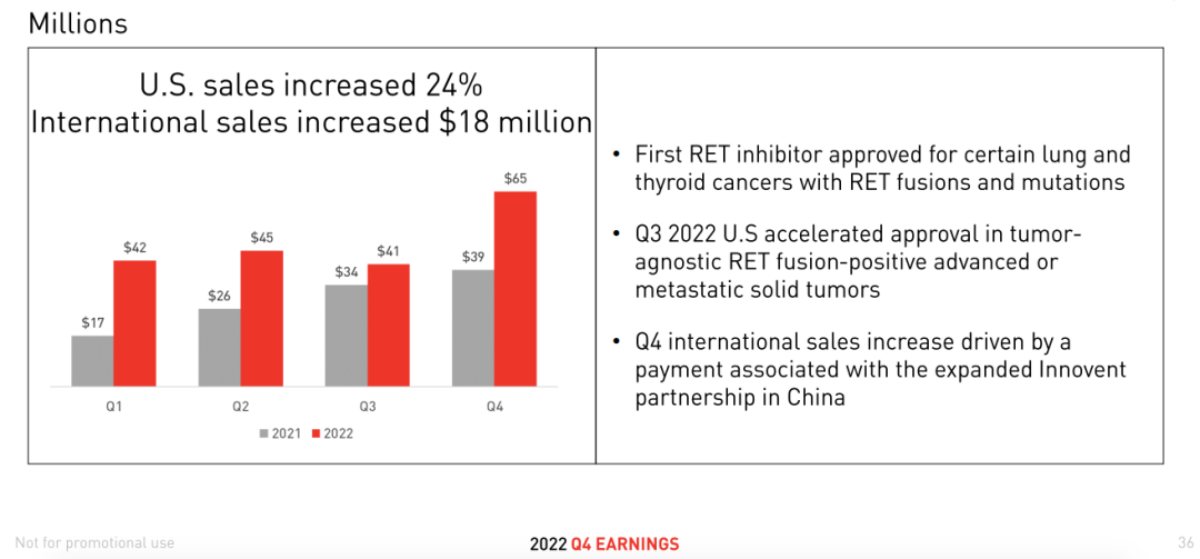 2023年2月,礼来制药发布财报。数据显示:塞普替尼2022财年全球营收为1.92亿美元,同比增加67%。2022年Q4业绩为6500万美元,单季度提升较快。