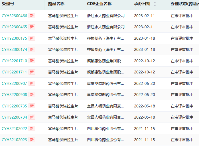 新分类报产伏诺拉生的在审受理号 (微信搜索"药融云小程序"进行相关更多数据查询)
