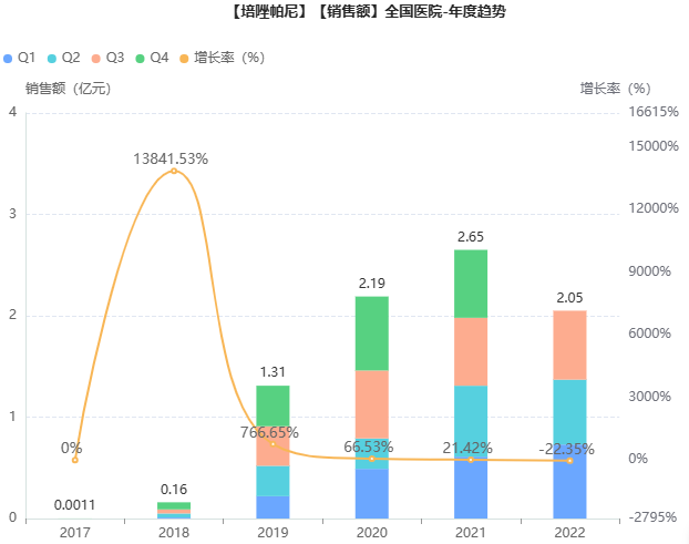 2017年2月21日,培唑帕尼获药监局批准用于晚期肾细胞癌患者的一线治疗,以及曾接受细胞因子治疗的晚期肾细胞癌患者的治疗。并在2018年10月经谈判降价65%,与舒尼替尼、阿昔替尼一同纳入国家医保。据药融云统计,目前培唑帕尼院内销售额仍保持着逐年递增趋势,2021年达2.65亿元,同比增长21.42%。