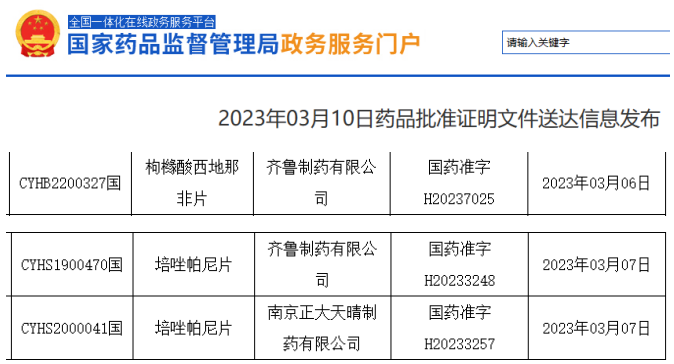 近日,NMPA发布新一批药品批准证明文件送达信息,其中,齐鲁制药2品种同日通过一致性评价:枸橼酸西地那非片、培唑帕尼片,其中培唑帕尼片为国内首仿药。值得注意的是,南京正大天晴的培唑帕尼片也同日获批,成为与齐鲁制药同时拿下国内首仿药的企业。
