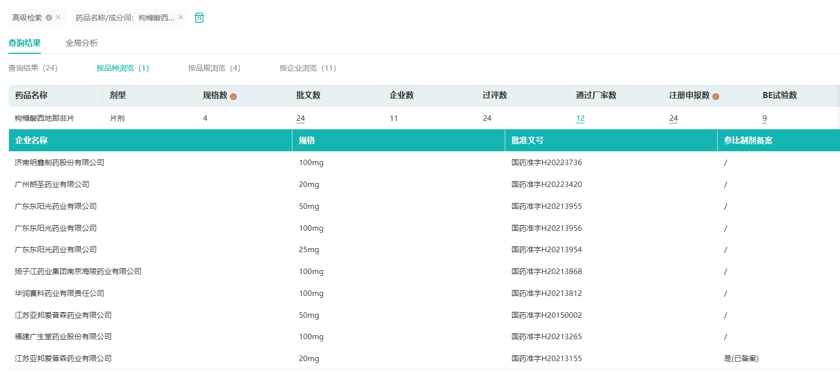 枸橼酸西地那非片一致性评价通过情况(微信搜索"药融云小程序"进行相关更多数据查询)