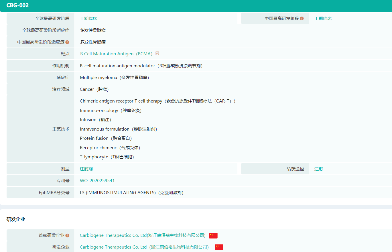 据此前CBG002的临床试验(NCT04706936)显示,CBG002是浙江康佰裕生物科技有限公司自主研发的BCMA靶向的第四代CAR-T细胞疗法产品,适用于多发性骨髓瘤的治疗。截至目前,暂时还没有国产BCMA靶向CAR-T细胞疗法获批上市。不过国内竞争形势已日趋激烈,药企们火力全开,大展身手,国产首款究竟鹿死谁手?(《国产首款BCMA靶向CAR-T疗法,上市在即!信达、科济、传奇...花落谁家?》)