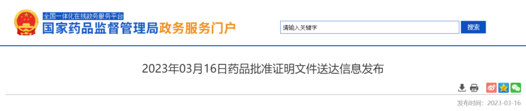 NMPA发布2023年03月16日药品批准证明文件送达信息