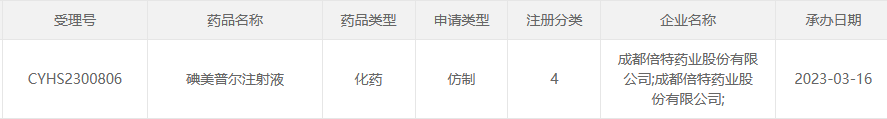 据CDE官网最新公示,成都倍特药业的4类仿制化药碘美普尔注射液上市申请获受理。目前,该4亿X射线造影剂国内仅原研和一家首仿药获批,还另有一家药企仿制药申报上市,倍特药业有望冲刺国产第二家。