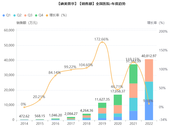碘美普尔原研来自意大利Bracco,是X射线非离子型碘造影剂,属于一种非离子型单体X射线造影剂。理化性质优异,与同类型的非离子型单体X射线造影剂相比,在同一浓度下,具有最低的渗透压及较低的粘滞度;更因其理化性质稳定,无需添加螯合剂。据药融云统计,2022年前三季度碘美普尔注射液的院内销售额已超2021年总额,突破4亿元,同比增长66%。