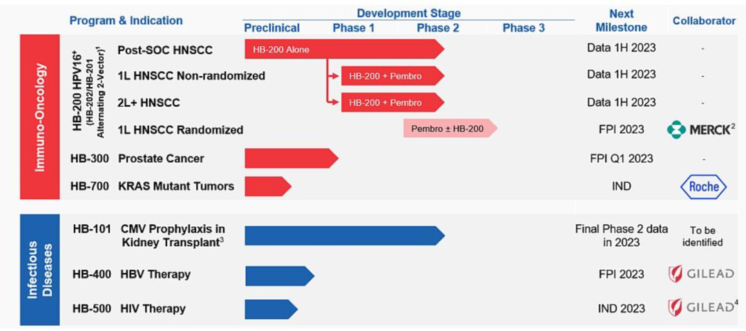 HB-200是一种治疗头颈癌的新型免疫疗法,在一线和二线+治疗中,HB-200联合帕博利珠单抗治疗以及作为标准治疗后的单独治疗进展至2期。登记工作正在进行中,HOOKIPA将在2023年第二季度通过新闻发布和投资者电话会议提供数据更新。