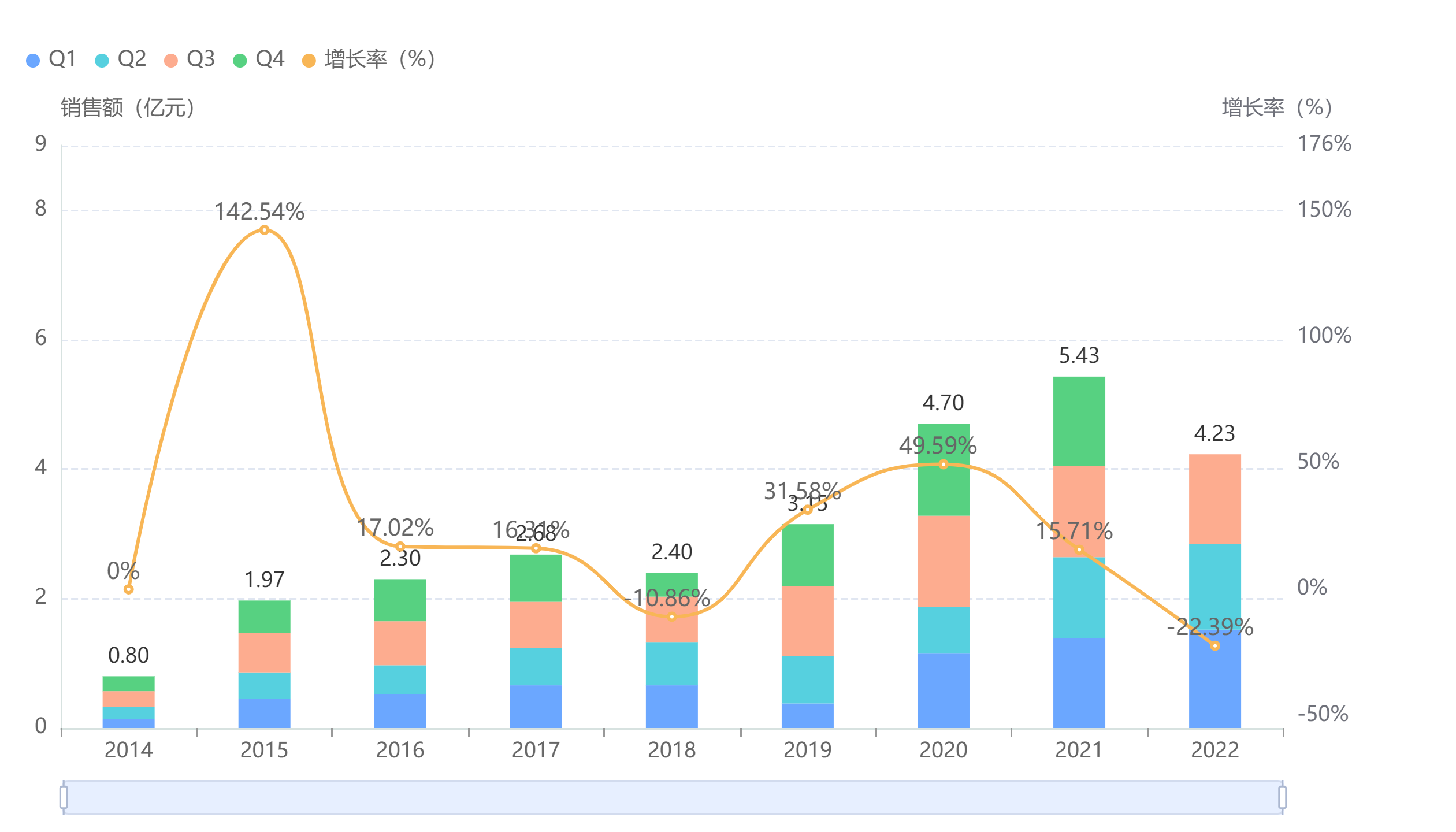 2023年以前,国内仅有原研诺华制药获批生产销售该高额特药。据药融云统计,尼洛替尼胶囊院内销售额总体呈持续递增趋势,到2021年销售额已有5.43亿人民币。现2022年前三季度已有4.23亿,预计全年销售额依旧延续其逐年增长趋势。
