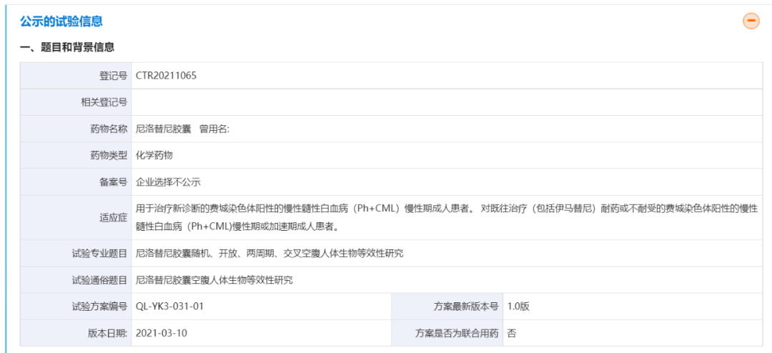 根据药物临床试验登记与信息公示平台显示,齐鲁制药已完成尼洛替尼胶囊随机、开放、两周期、交叉空腹人体生物等效性研究。