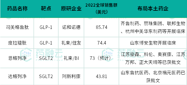 2022年,全球糖尿病药物的市场规模为596亿美元,其中销售额前4位为2款GLP-1受体激动剂和2款SGLT2抑制剂,如下表所示。其中司美格鲁肽专利将于2026年到期,也给了国产司美格鲁肽机会;恩格列净和达格列净已有本土药企获得批文。