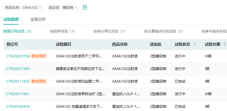 据药融云数据库,鸿运华宁的重组抗人GLP-1受体人源化单克隆抗体注射液(格鲁塔珠单抗,GMA102)针对2型糖尿病的研究最高已至III期临床阶段。