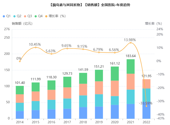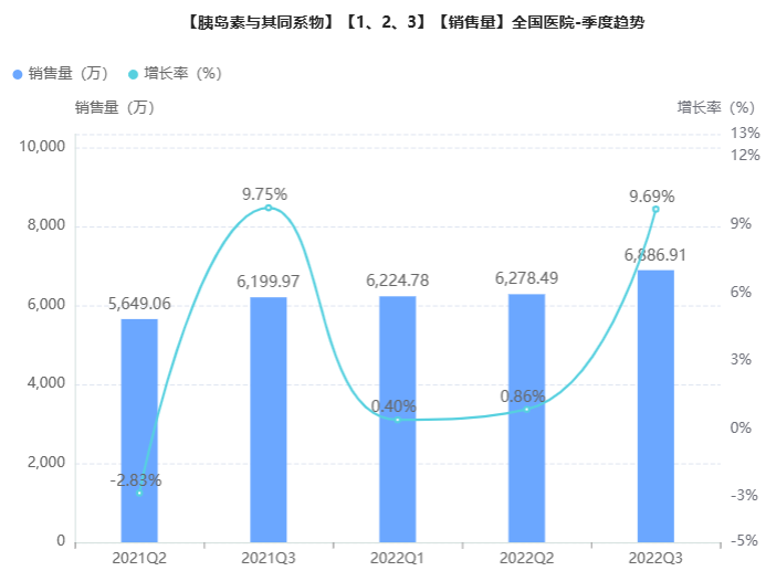 2022年5月,中选结果正式实施,胰岛素市场也随之回落。据药融云数据库,2022年Q2/Q3胰岛素及其同系物院内销售量环比小幅增长分别0.86%和9.69%,院内市场额则接连下滑,分别环比下降了20%和31%。与之相对,非胰岛素类降糖药和糖尿病用其他药2022年前三季度则是同比上涨了20%。