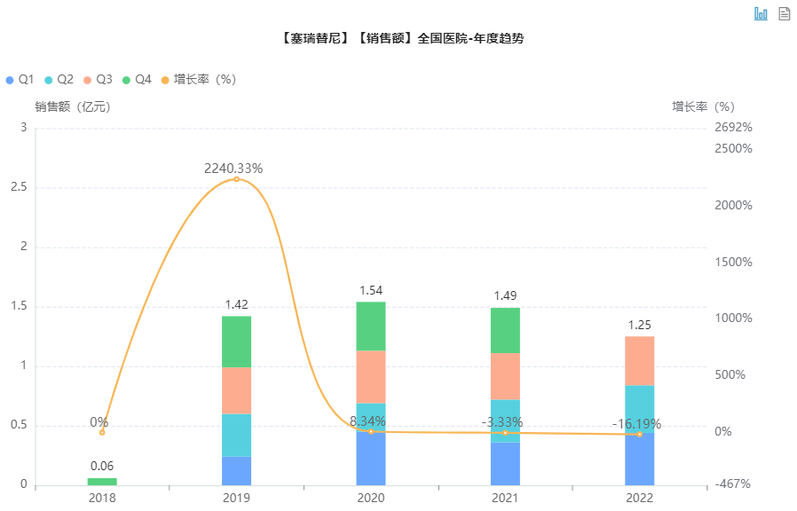 塞瑞替尼胶囊于2014年首次在美国上市,随后分别在英国、日本和欧盟上市。2018年,诺华的塞瑞替尼胶囊进口获NMPA批准,适用于间变性淋巴瘤激酶(ALK)阳性的局部晚期或转移性非小细胞肺癌(NSCLC)患者的治疗。据药融云统计,塞瑞替尼近年的院内销售额均在1.5亿元左右。现2022年前三季度的销售额已有1.25亿,预计全年可达到阶段性突破,销售额超1.6亿元。