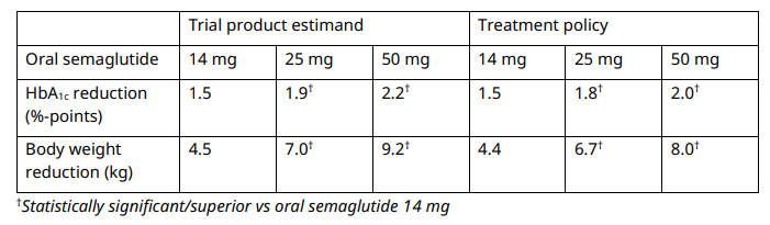 在IIIb期试验中,诺和诺德将其25毫克和50毫克剂量的口服司美格鲁肽与目前最大批准剂量的14毫克版本进行了比较。该试验研究了在需要强化治疗的2型糖尿病患者中,当添加到稳定剂量的一到三种口服降糖药时,剂量如何比较。
