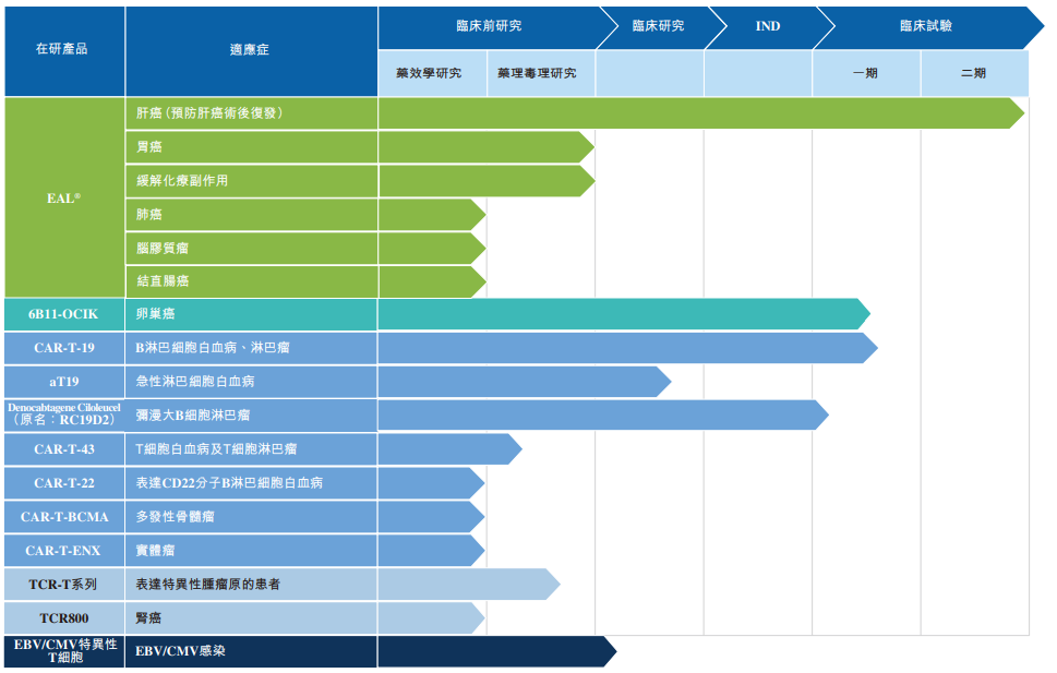 公司目前有多个TCR-T细胞疗法在研产品正进行临床前研究,针对的靶抗原包括NY-ESO-1等睪丸癌抗原或胎盘癌抗原,以及CMV、EBV及HPV等病毒来源的抗原。公司已于2021年1月11日与T-Cure订立许可协议。公司获授有关针对HLAA-11受限制患者的肾细胞癌逆转录病毒载体的TCR免疫疗法之独家许可。