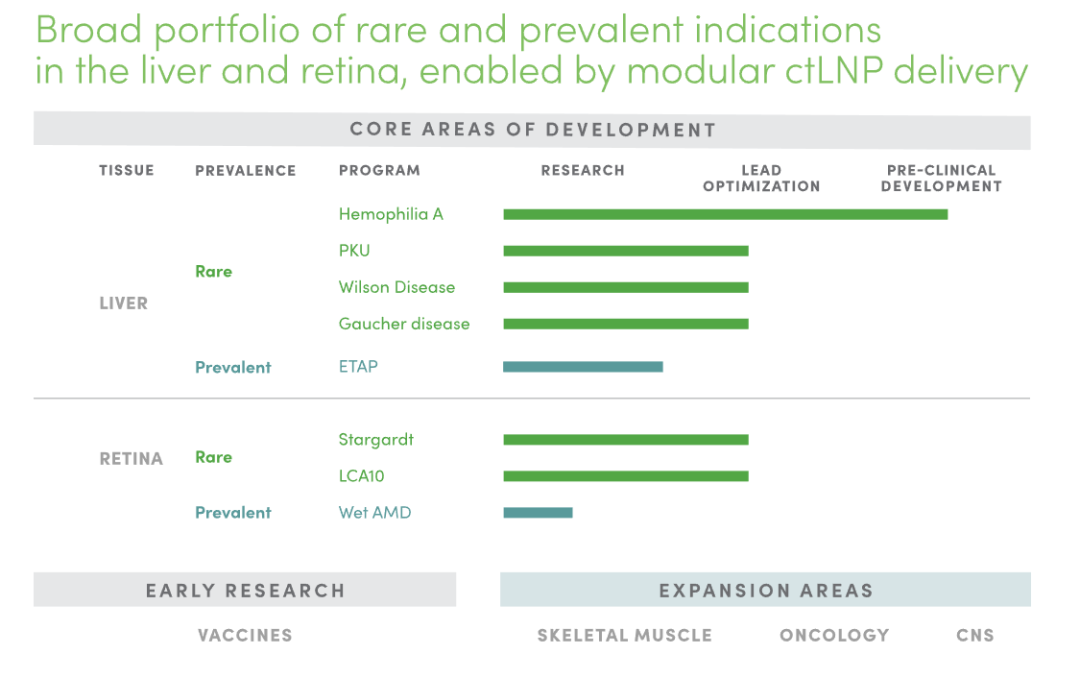 Generation Bio的非病毒基因疗法围绕两个平台展开:第一个平台被称为“ceDNA”,旨在提供更大、表达更持久的基因;第二种被称为“ctLNP”,一种非病毒传递载体,旨在逃避免疫系统并靶向特定器官。