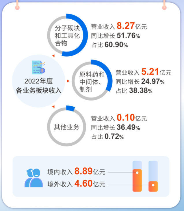 根据皓元医药2022年业绩,主要可以分成两个方面。从分板块来看,分子砌块和工具化合物营收8.27亿元,同比增长51.76%;原料药和中间体、制剂业务营收5.21亿元,同比增长25%;其中仿制药领域,实现收入2.09亿元,在后端业务中占比40.13%,项目数249个;创新药领域,实现收入3.1亿元,在后端业务中占比59.87%,同比增长57.94%,项目数456个;