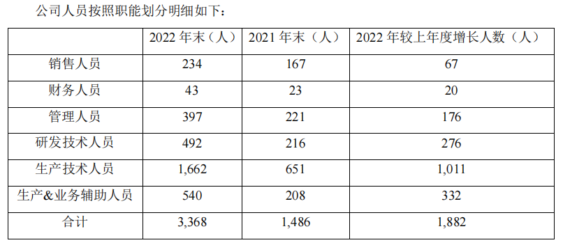 2022年,公司新增1,882 人,其中研发人员占比14.67%。截至皓元医药2022年业绩报告期末,公司共有员工3,368人,其中技术人员2,154人,技术团队中硕士和博士比例为22.42%。