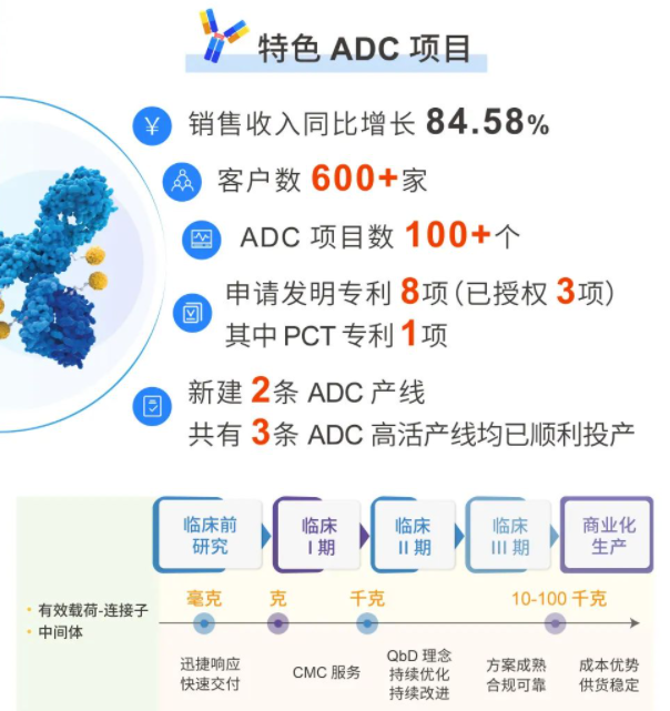 据皓元医药2022年业绩显示,公司ADC项目研发力度持续增强,ADC项目数超100个,销售收入同比增长84.58%,合作客户超过600家,同比增长84.10%,服务的项目阶段包含了临床前、临床I/II/III期及上市阶段,合作产品包括MMAE、Vc-MMAE、MMAF等。此外,公司还进一步加快了产线建设速度,马鞍山研发中心继2021年一条ADC产线建成并投产后,新建的两条ADC产线也在报告期内顺利投入运营,截至报告期末,公司三条ADC高活产线均已顺利投产。