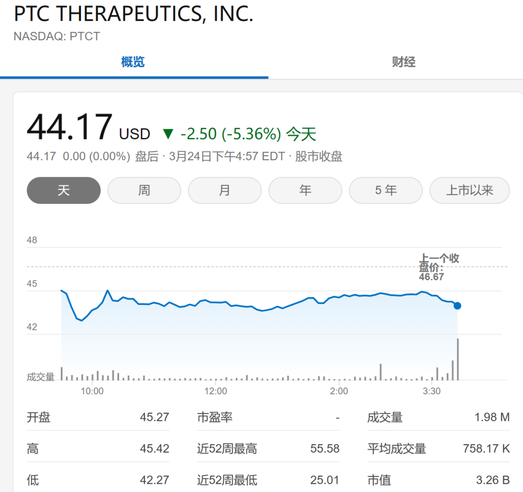 2013年PTC Therapeutics在纳斯达克上市,目前市值约32亿美元,受到CEO辞职消息影响,股价上周五收盘下跌5%。