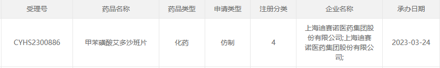 据CDE官网公示,上海迪赛诺医药递交的又一项甲苯磺酸艾多沙班片仿制药申报上市申请获受理。2022年前三季度,该抗凝药物销售额大涨302%,一举破亿!目前该品种国内仅1家原研+1家仿制获批生产,上海迪赛诺医药冲刺国产第2家,正面迎战正大天晴、扬子江药业.....