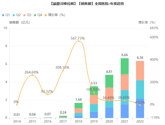 据药融云统计,碳酸司维拉姆近年在我国院内市场出现了大规模的扩展趋势,2021年的院内销售额同比增长了38.69%,达到6.66亿人民币。现2022年前三季度的销售额已逼近前一年总额,同比增长31%。