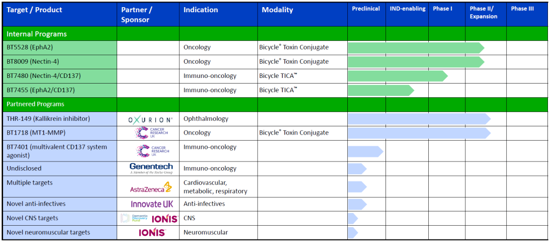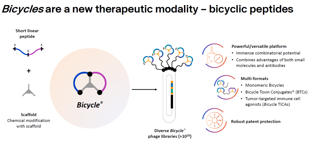Bicycle公司是一家处于临床阶段的生物制药公司,致力于通过双环肽(Bicycle)技术开发创新药物。Bicycle是由两个环构成的短肽,具有良好的组织渗透率和肾脏清除率、高度的亲和力和选择性等优点。