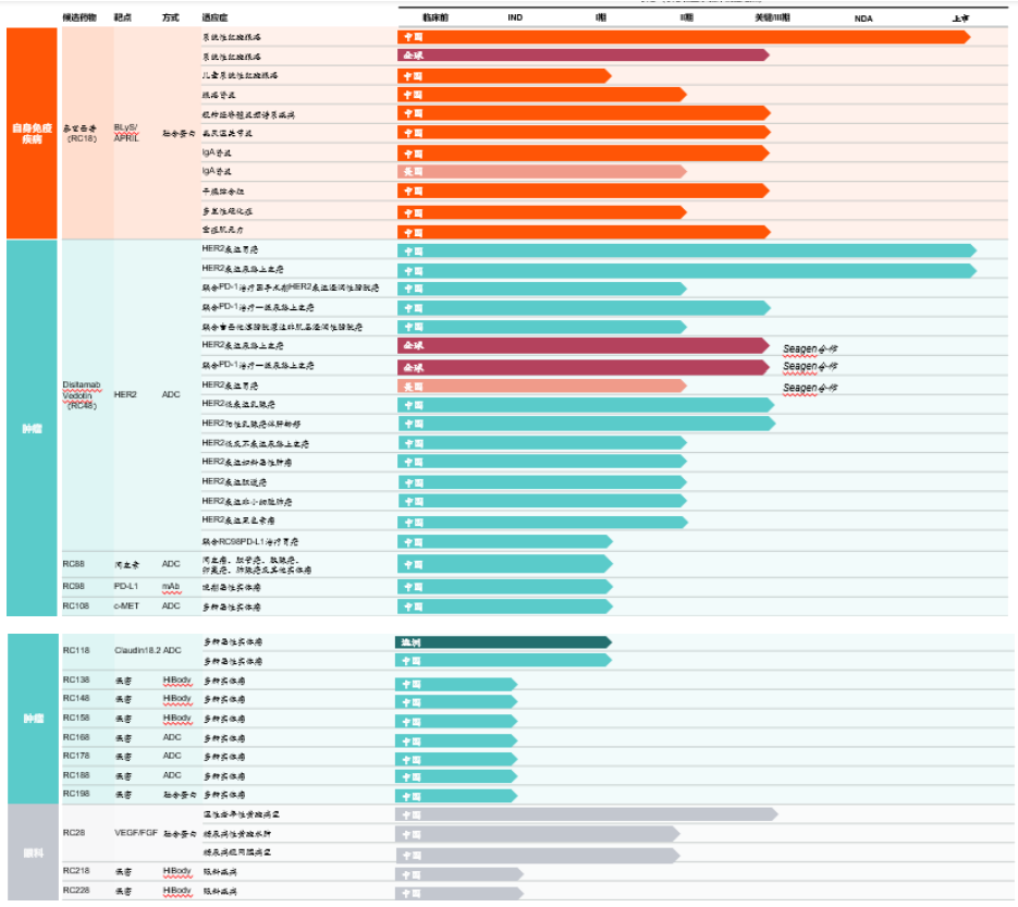 荣昌生物目前共有七个分子处于临床开发阶段。已进入商业化阶段的药物泰它西普(RC18,商品名:泰爱)和维迪西妥单抗(RC48,商品名:爱地希)正在中国及美国进行针对多种适应症的临床试验,并取得了多项积极进展。此外,RC28、RC88、RC98、RC108、RC118等其他分子临床进展顺利,将陆续进入关键临床试验阶段。