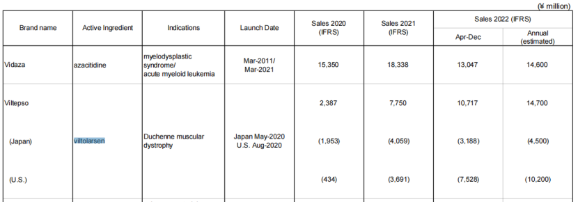 其中小核酸药物VILTEPSO前三季度营收107亿(约5.6亿人民币),其中日本销售额为31.9亿日元,美国为75.3亿日元,公司预计全年营收147亿日元(约7.7亿人民币),相比去年同期77.5亿元,大幅增长90%。