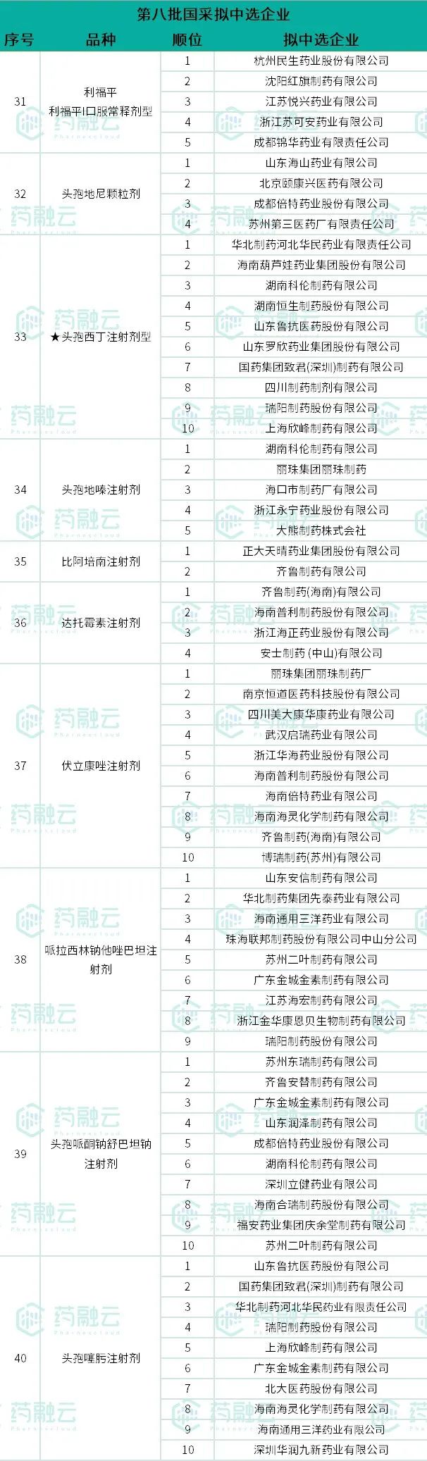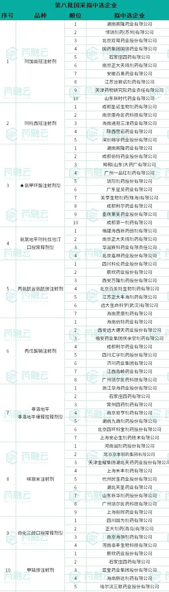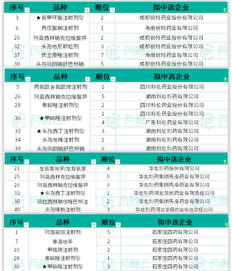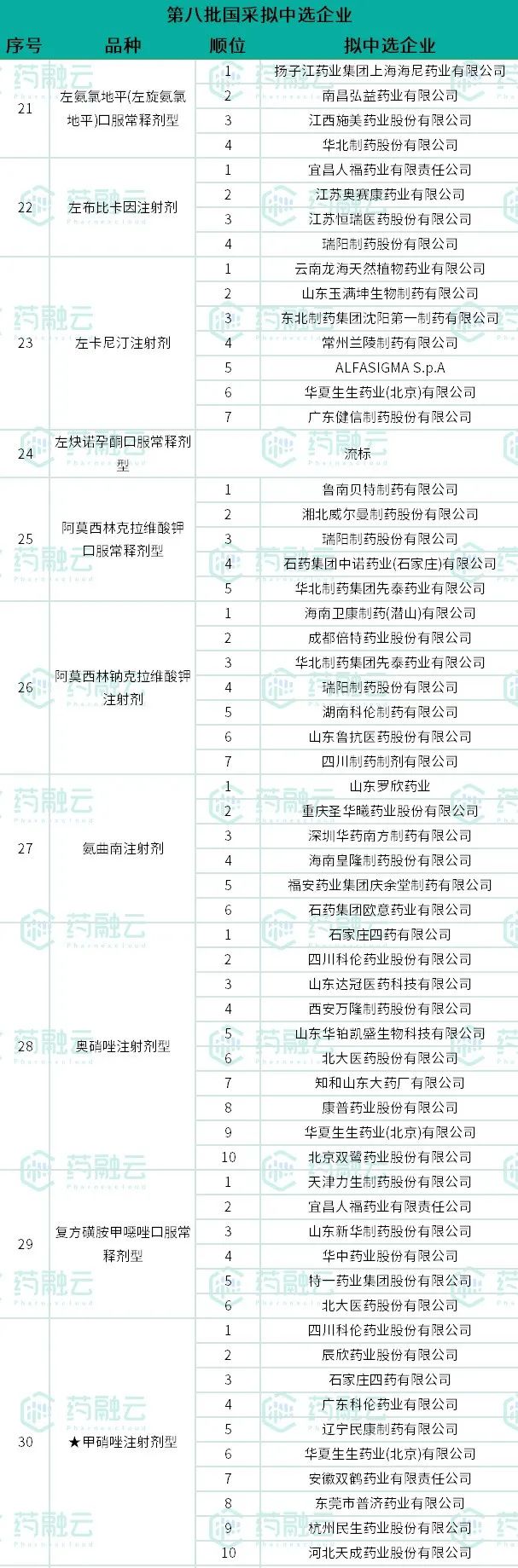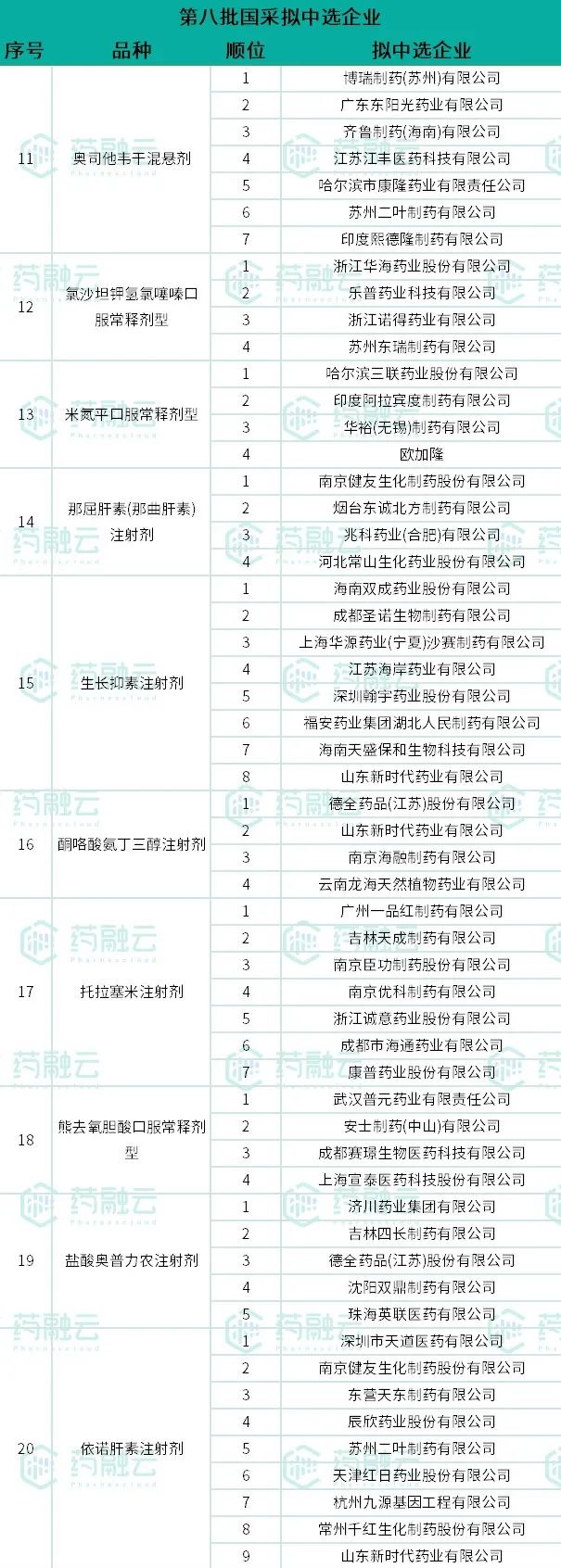 结合网络流传信息及新闻媒体报道,药融云整理了第八批国家药品集采拟中选结果,如下表1—表4,仅供参考,一切以官方消息为准!