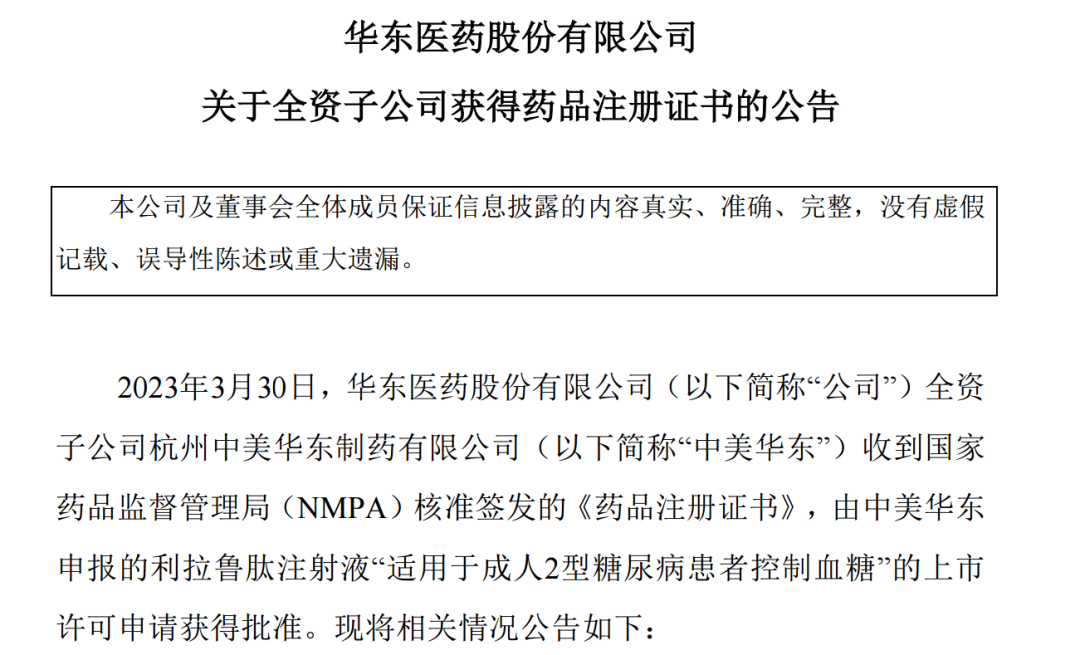 3月30日晚间,华东医药发布公告,该公司全资子公司中美华东制药收到国家药品监督管理局(NMPA)核准签发的《药品注册证书》,由中美华东制药申报的利拉鲁肽注射液(商品名:利鲁平®)“适用于成人2型糖尿病患者控制血糖”的上市许可申请获得批准。据悉,华东医药是国产首家获批该糖尿病新药的企业。