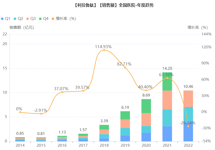 在国内市场,据药融云全国医院销售数据库显示,利拉鲁肽近几年的销售额一直是水涨床高,保持着呈逐年递增趋势。2021年销售额大涨63%,首次突破亿元大关,直达14.2亿,现2022年前三季度也已超十亿,市场动力十足。2023年3月1日,2022年最新版医保目录发布,利拉鲁肽注射液谈判成功,被纳入乙类,限用于血糖控制不佳的成人2型糖尿病患者。