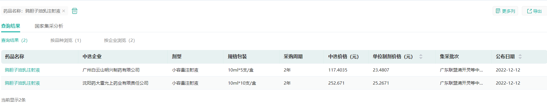 2022年12月12日,《广东联盟清开灵等中成药集中带量采购》结果公布,广州白云山明兴制药与沈阳药大雷允上药业的鸦胆子油乳注射液被纳入,中选价格每瓶在23-25元,采购周期2年,在广东、山西、河南、海南、宁夏、青海等省份供应。此次全国中成药集采,除沈阳药大雷允上药业、广州白云山明兴制药可接着申报外,九旭药业也可根据官方发布的企业申报条件的进行申报。