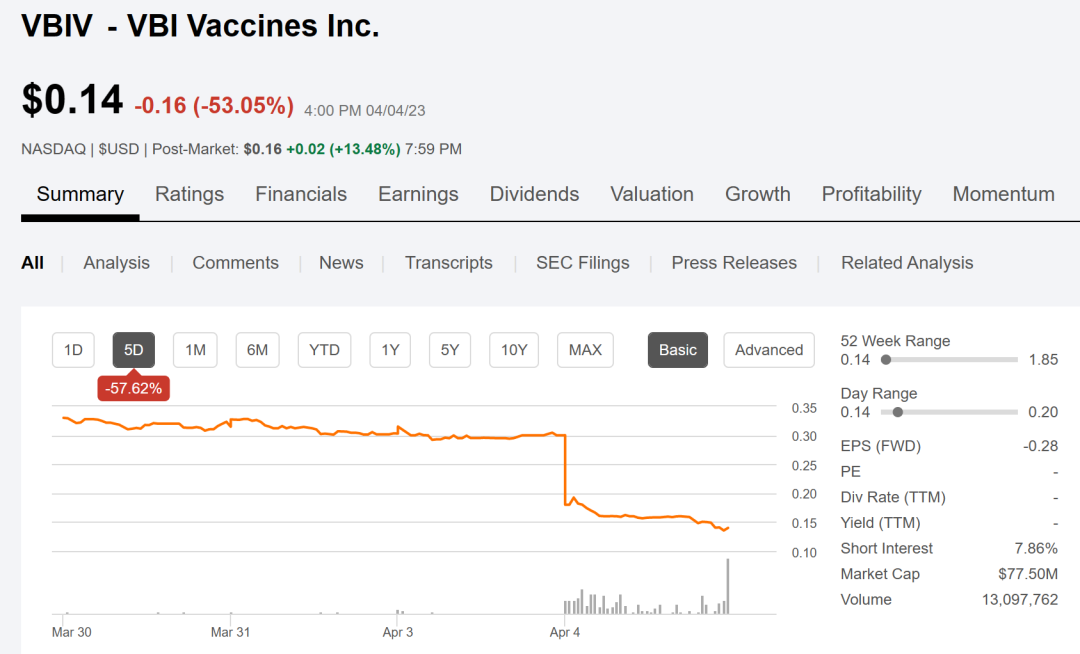 受此消息影响,VBI公司股价在周二大跌53.05%,目前市值7750万美元。