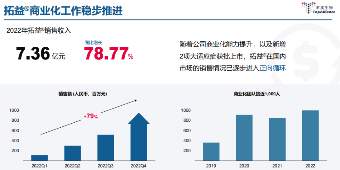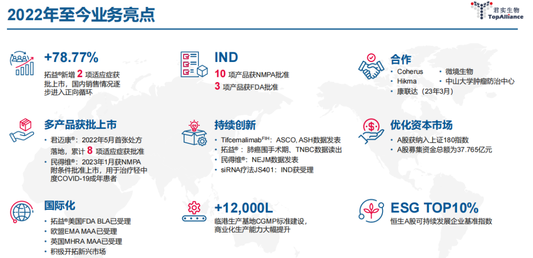 商业化生产能力大幅提升。在产能扩充方面,公司上海临港生产基地于2022年5月获得NMPA批准,可与苏州吴江生产基地同时负责生产商业化批次的拓益®。上海临港生产基地按照CGMP标准建设,报告期内新增产能12,000升,目前产能已达42,000升。