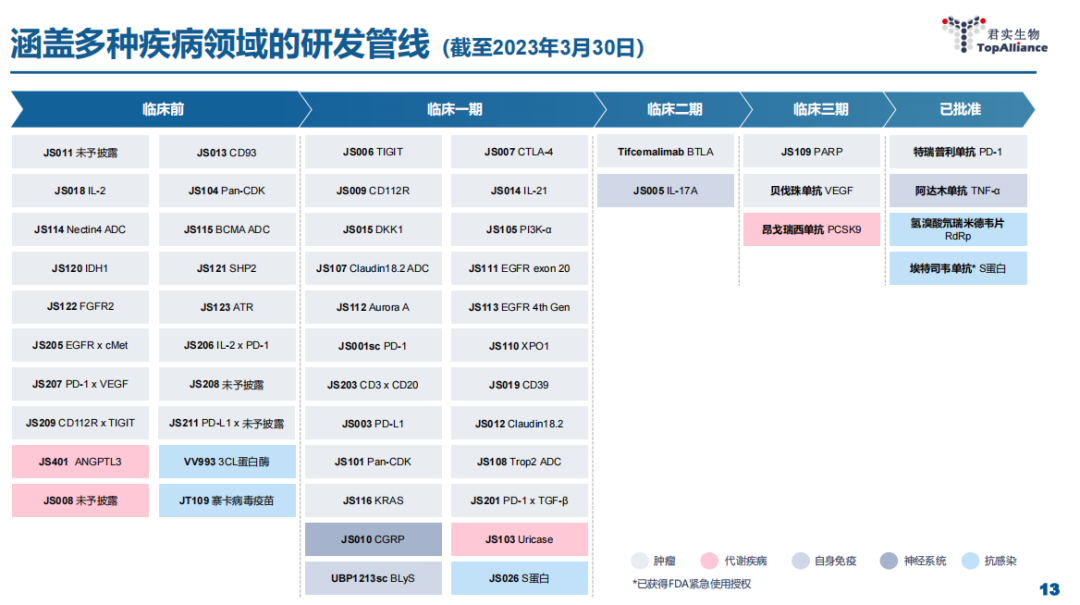 截至君实生物2022年报披露日,公司在研产品管线覆盖五大治疗领域,包括恶性肿瘤、自身免疫系统疾病、慢性代谢类疾病、神经系统类疾病以及感染类疾病。其中,处于商业化阶段的产品共4项(拓益、君迈康、民得维及埃特司韦单抗),近30项在研产品处于临床试验阶段(其中昂戈瑞西单抗、贝伐珠单抗以及PARP抑制剂处于III期关键注册临床试验阶段),超过20项在研产品处在临床前开发阶段。