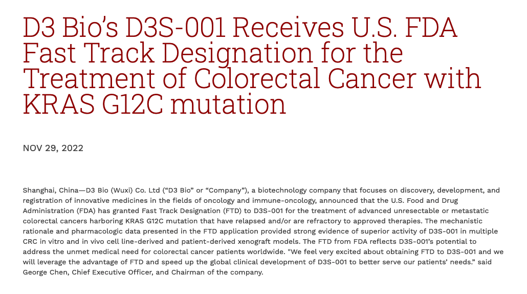https://www.d3bio.com/press-releases/d3-bios-d3s-001-receives-u-s-fda-fast-track-designation-for-the-treatment-of-colorectal-cancer-with-kras-g12c-mutation;