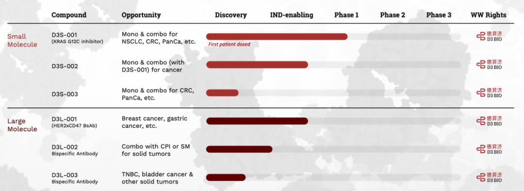 德昇济医药的英文名D3 Bio:寓意为“开发(Development)促进发现(Discovery),从而又带来更多开发(Development)。”德昇济医药定位为全球型的Biotech;目前,已建立包括6款自主研发的候选新药产品管线,涵盖小分子以及抗体/双抗领域。其中小分子药物涉及:D3S-001、D3S-002、D3S-003(相关专利:CN115298174A,嘧啶并杂环类化合物及其应用)。大分子药物涉及:实体瘤的靶向HER2和CD47的双抗D3L-001、D3L-002、D3L-003。