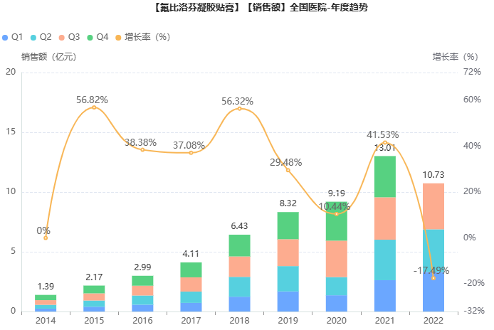 目前国内上市的氟比洛芬制剂有3款,包括凝胶贴膏剂型、注射液剂型以及缓释片剂型,均为国家医保乙类品种。其中,氟比洛芬凝胶贴膏原研来自日本三笠制药,2010年由泰德制药通过进口分包装销售的方式引进中国市场,是国内上市最早的化药凝胶贴膏剂产品。据药融云数据,氟比洛芬凝胶贴膏2021年院内销售额超13亿。