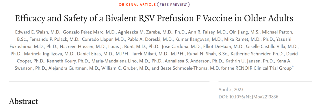 RENOIR是一项随机、双盲、安慰剂对照的全球性3期临床试验,用于评估60岁以上老年人接种单剂量RSVpreF疫苗的有效性和安全性。此次试验共招募了37000位受试者,按照1:1的比例接种RSVpreF疫苗或安慰剂。