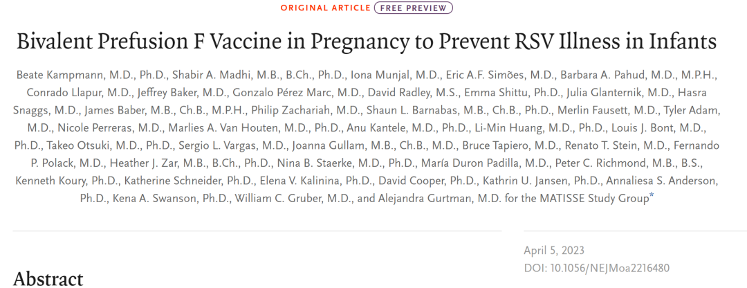 MATISSE临床3期试验旨在评估在妊娠24-36周的孕妇接种单剂量RSVpreF疫苗的有效性和安全性。MATISSE试验招募了约7400名孕妇,按照1:1的比例接种RSVpreF疫苗或安慰剂。