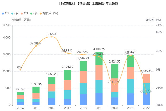 骨质疏松症治疗药物可分为骨吸收抑制剂、骨形成促进剂及其他机制药物。据药融云数据库显示,我国目前唯一获批的骨形成促进剂为特立帕肽,已有原研礼来、上海联合赛尔生物和信立泰药业获得批文,院内销售额在3千万元左右。