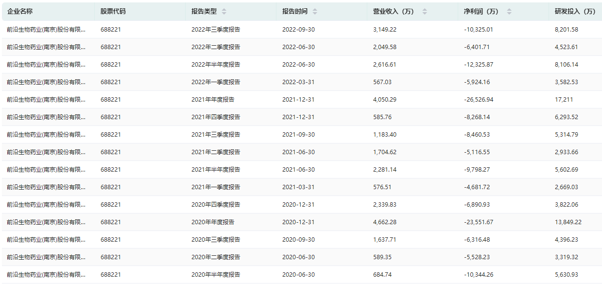 前沿生物历年年报/季报数据查询(部分)